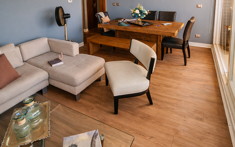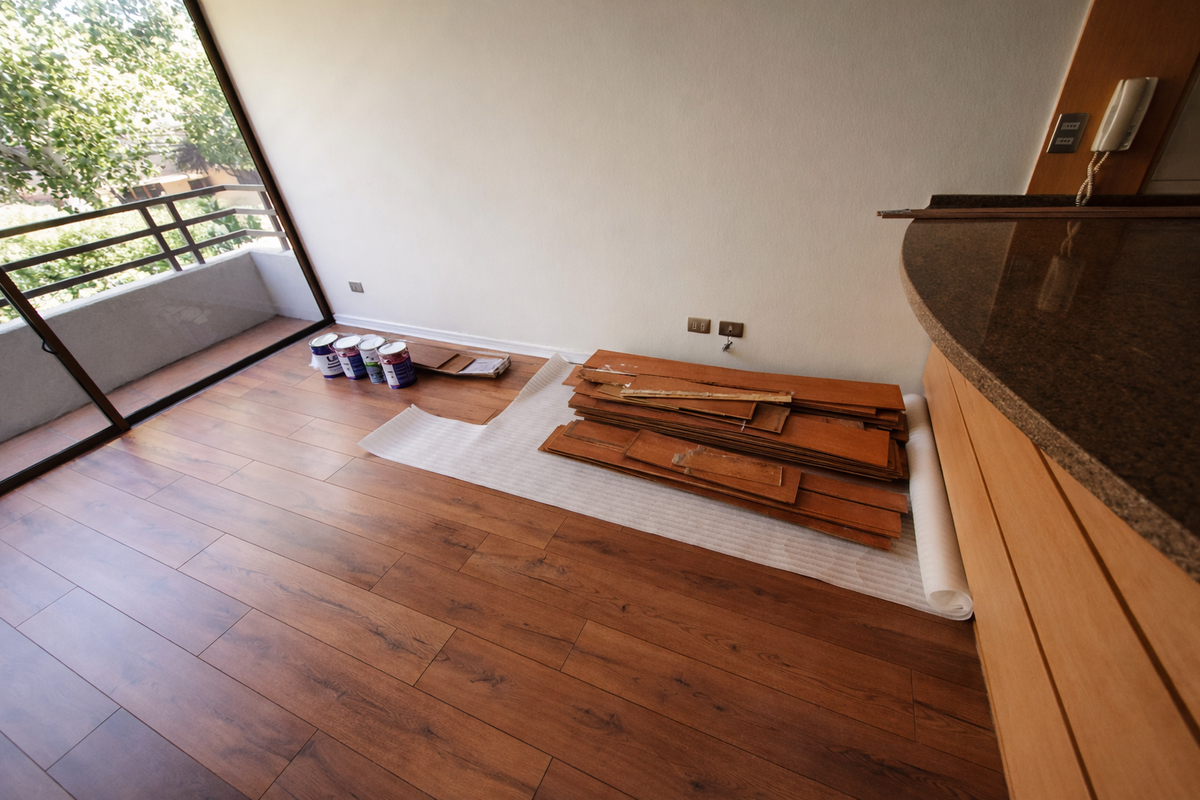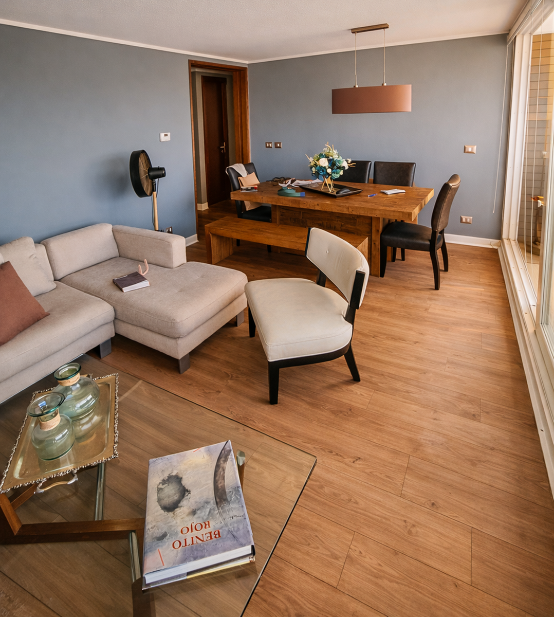 Adicionalmente, se realizó cambio de piso flotante en área de living–comedor, mejorando terminaciones y actualización estética del espacio.