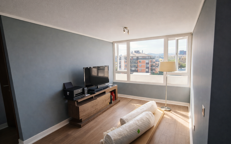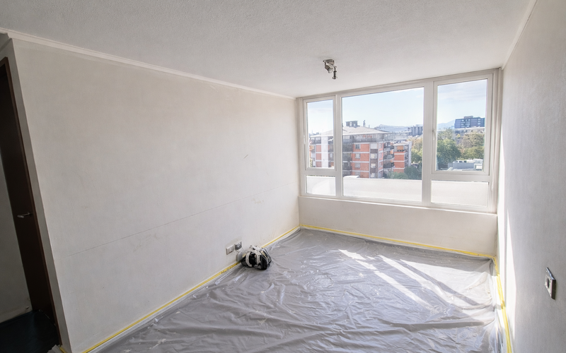 Proyecto de terminaciones ejecutado en departamento ubicado en la comuna de Ñuñoa, contemplando retiro de papel mural existente, aplicación de pasta muro para nivelación de superficies y posterior pintura de cielos y muros.